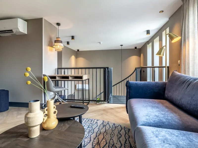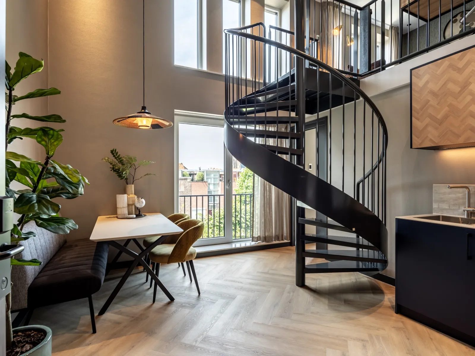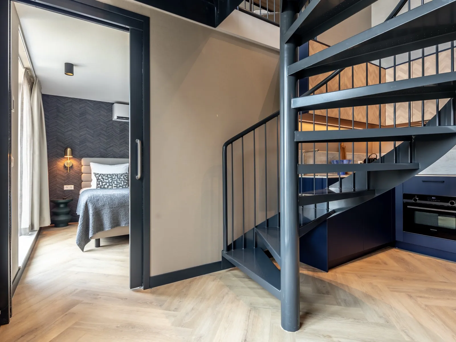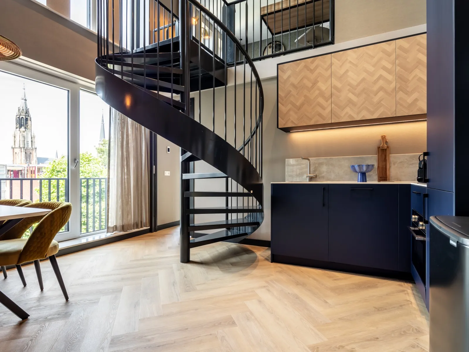 The unique layout makes this 1-bedroom apartment one of a kind. Downstairs the clever open floor plan gives you a fully equipped kitchen and a dining area. Alongside the bedroom features comfortable box spring beds and a SMART TV with Chromecast. Connected to the bedroom is a stylish ensuite bathroom and toilet. Dedicated laundry facilities like a washer and dryer combination is present. Enjoy a small balcony offering a pleasant view of the communal garden. A charming spiral staircase leads to the upper living area, boasting stunning views of Delft's famous churches. You will immediately experience the inviting ambiance. Relax in the stylish living room with a cozy seating area and another SMART TV with Chromecast. A reliable high-speed internet connection is provided. Air conditioning provides both warmth and coolness ensuring comfort year-round. The apartment comfortably accommodates up to 2 guests and is suitable for both short and longs stays.