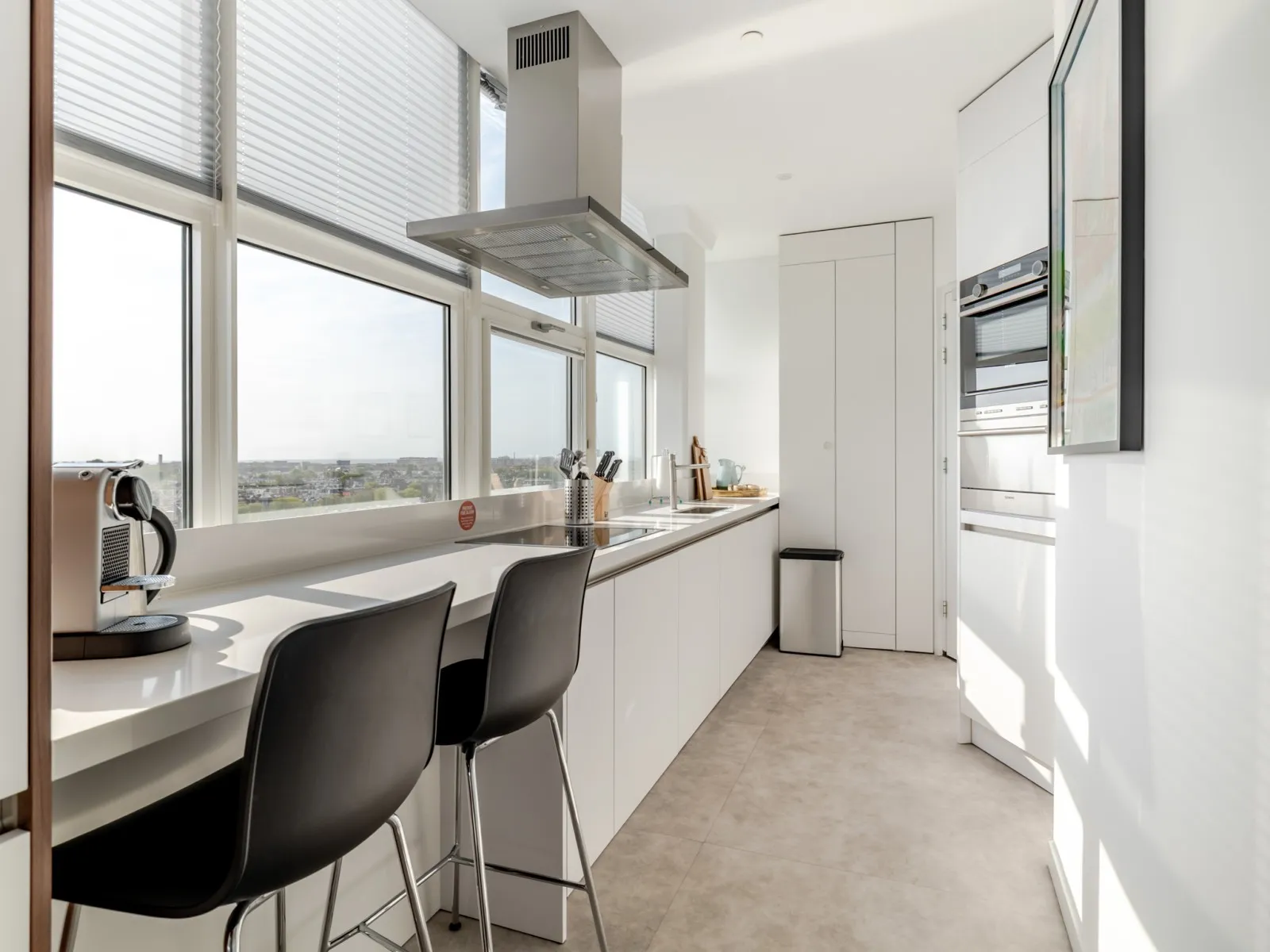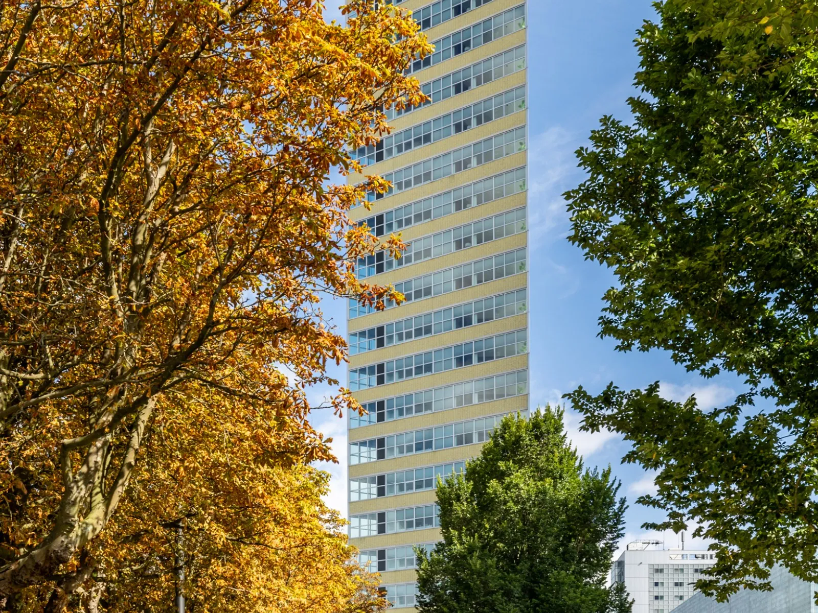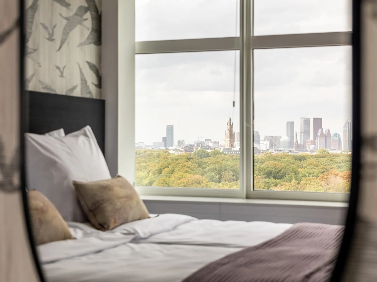 Located on the 5th to 11th floors, the apartments offer wide views across The Hague. The outlook changes with the light and the seasons, ensuring a fresh and fascinating perspective every day. A view that keeps you looking. The bedroom can be completely separated from the living room by a sliding wall. Here you will sleep soundly in a comfortable double bed and find a second flat-screen TV. The modern bathroom with walk-in shower and sink is centrally located between the kitchen and living room, along with a separate toilet for extra comfort.
