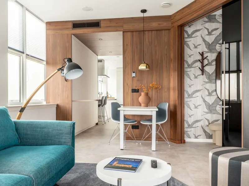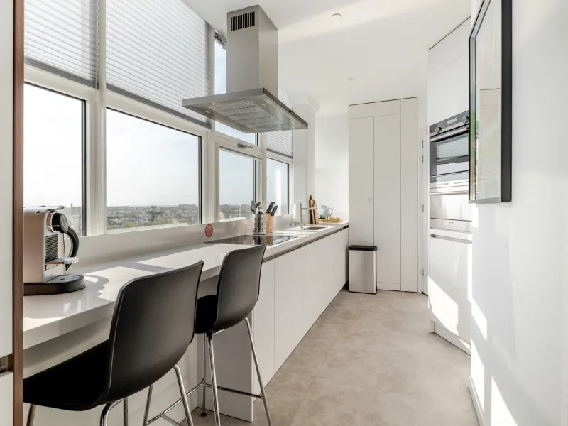 Type 2 apartments are identical in layout to type 1, but located on the 5th to the 11th floor and offer a panoramic view of The Hague and the coastline. The apartments are finished to a high standard and feature a modern kitchen with built-in appliances, including a practical washer-dryer combination and a dining table that can also be used as a workplace. The bright living room is furnished with a comfortable sofa and a luxurious armchair - a perfect place to relax watching TV or just to enjoy the beautiful view.