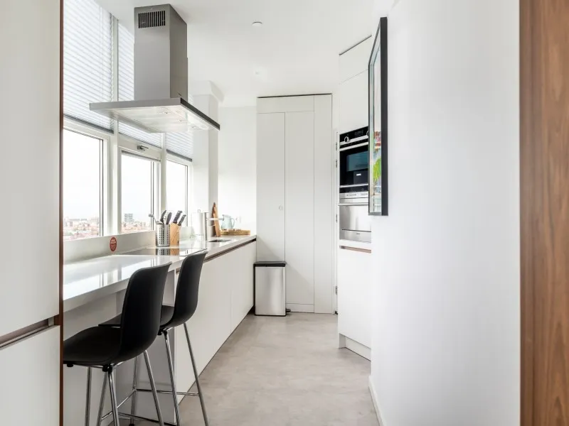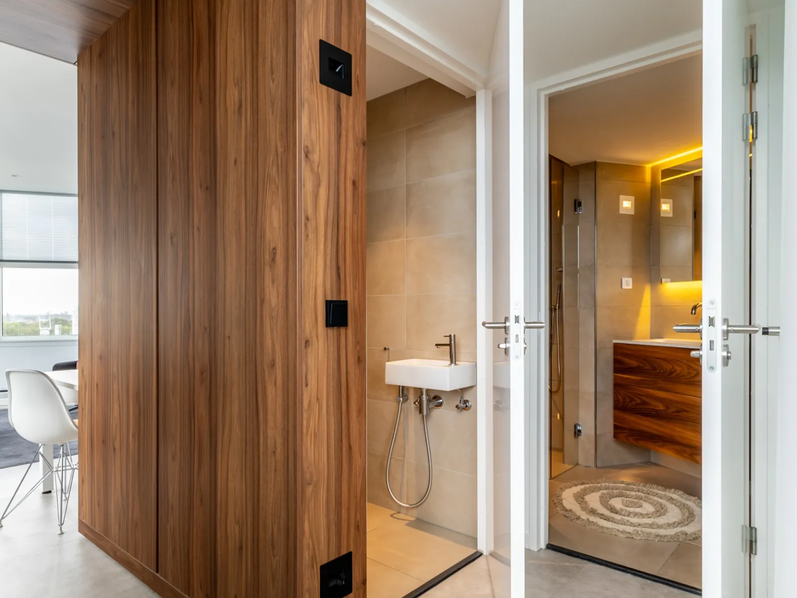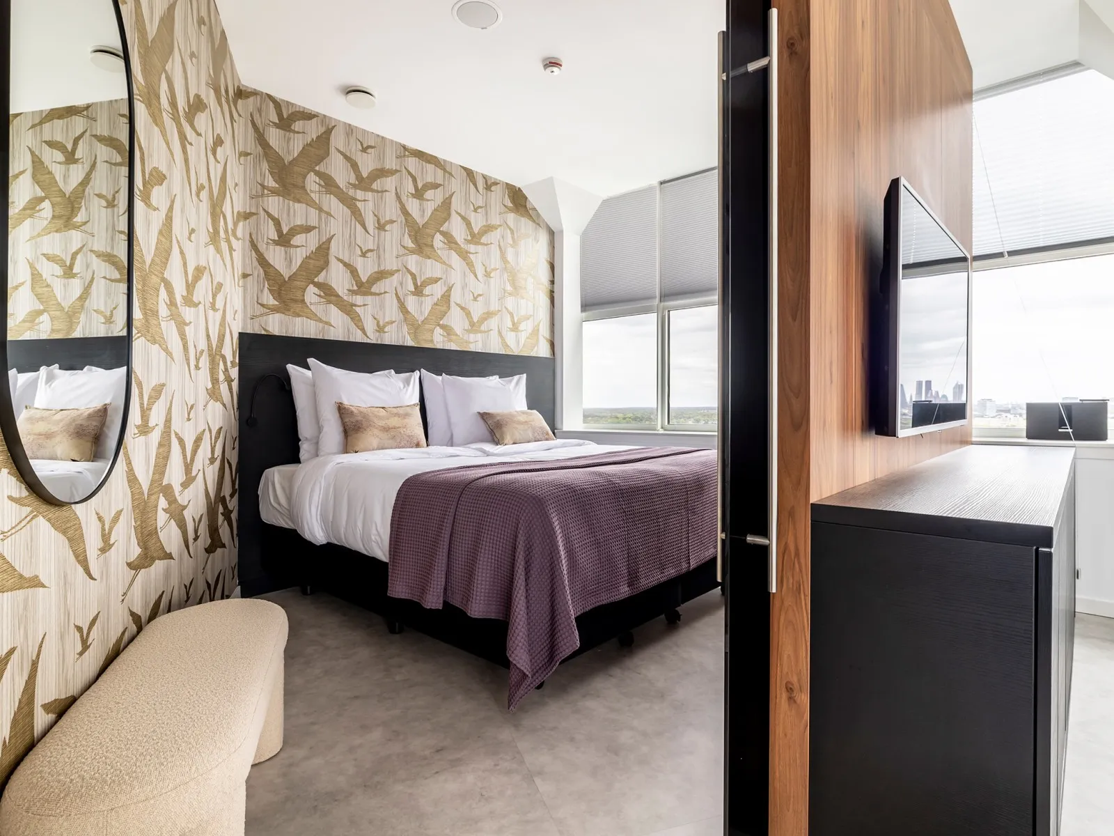 Situated on the 12th to 18th floors, the apartments open up to even broader views of The Hague and the North Sea. The skyline and the sea horizon shift with the light and the seasons, offering a panorama that remains endlessly fascinating to look at. The bedroom can be completely separated from the living room by a sliding wall. Here you will sleep soundly in a comfortable double bed and find a second flat-screen TV. The modern bathroom with walk-in shower and sink is centrally located between the kitchen and living room, along with a separate toilet for extra comfort.