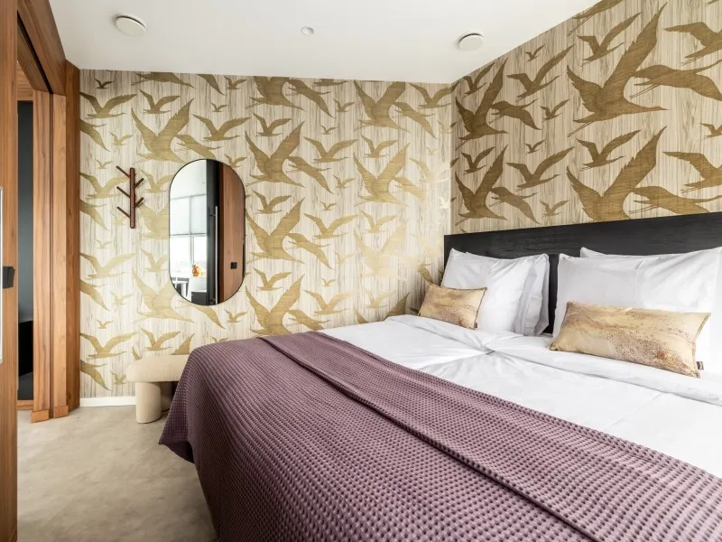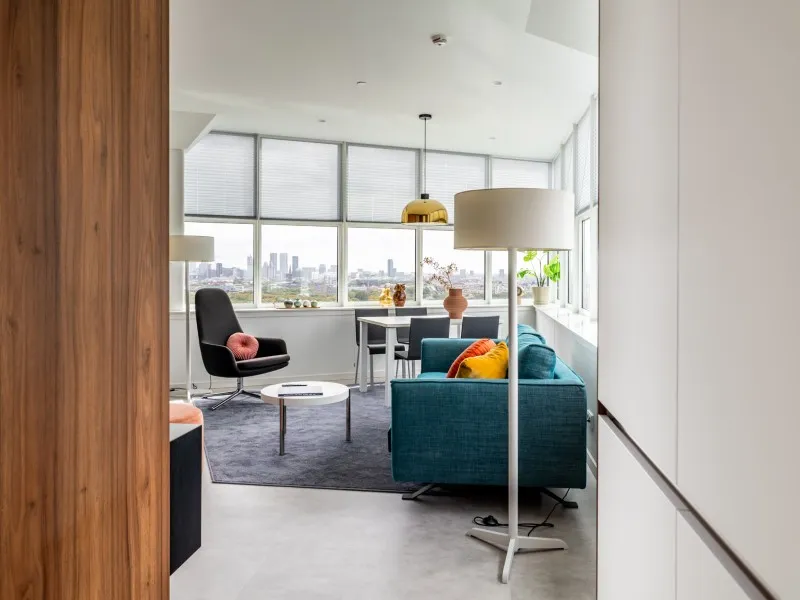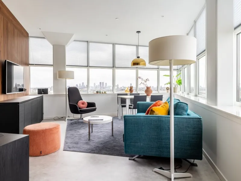 Type 3 apartments are identical in layout to type 2 and type 1, but located on the 12th to the 18th floor and offer a panoramic view of The Hague and the coastline. The apartments are finished to a high standard and feature a modern kitchen with built-in appliances, including a practical washer-dryer combination and a dining table that can also be used as a workplace. The bright living room is furnished with a comfortable sofa and a luxurious armchair - a perfect place to relax watching TV or just to enjoy the beautiful view.