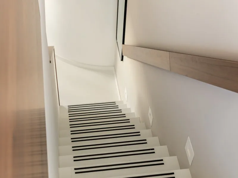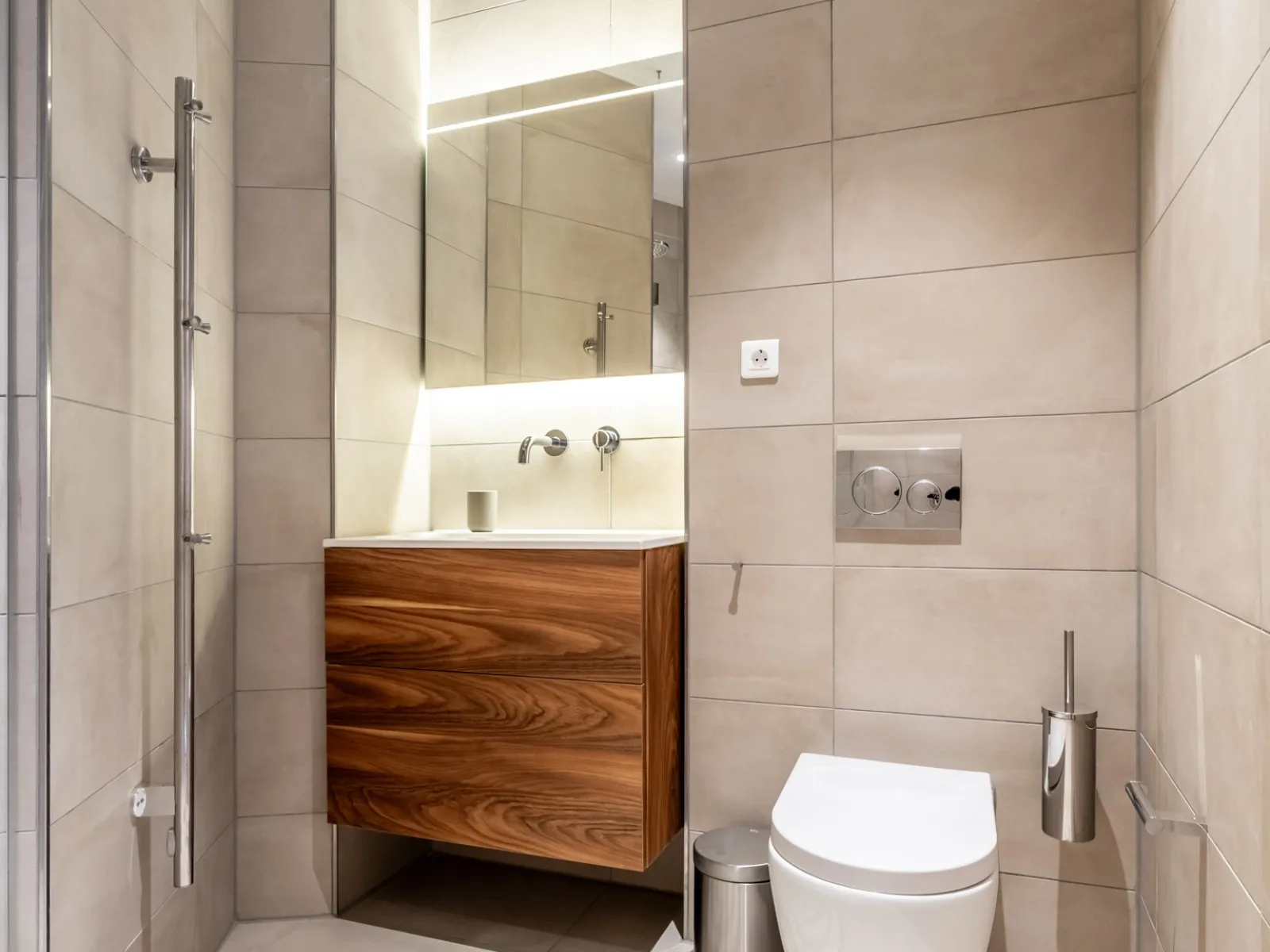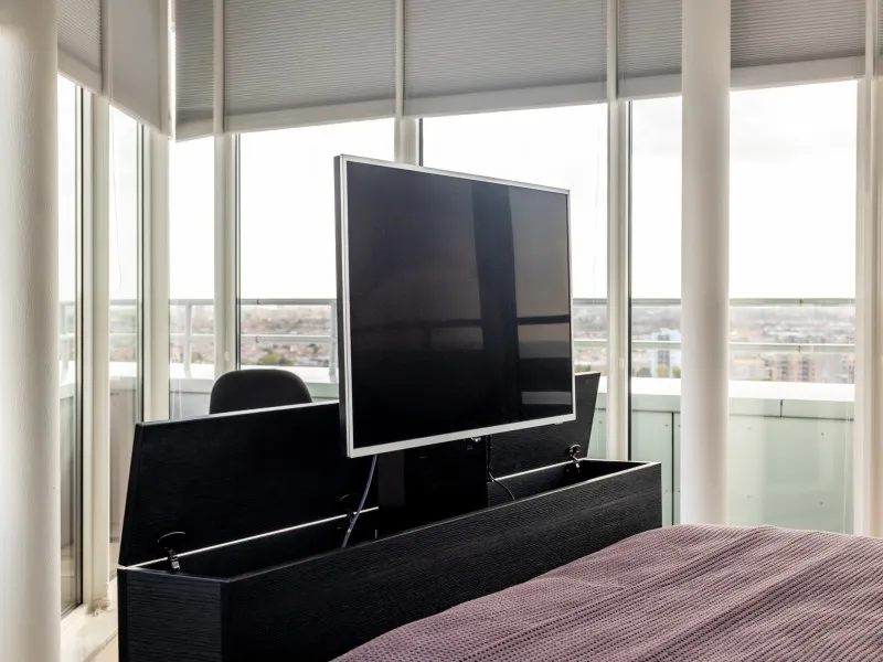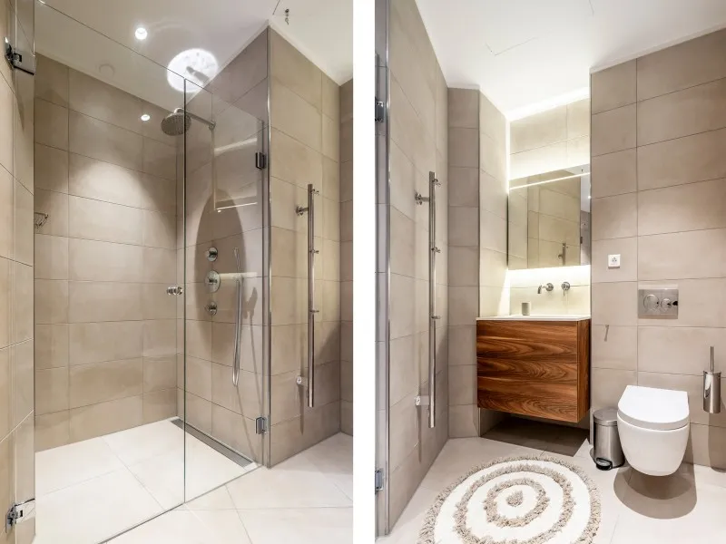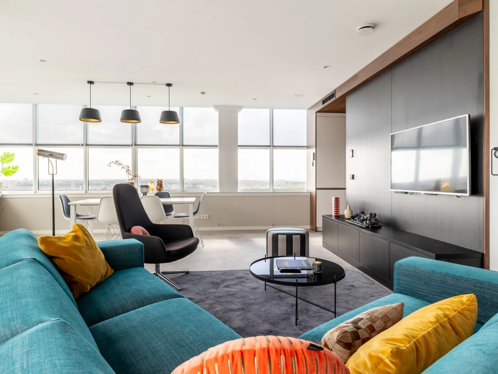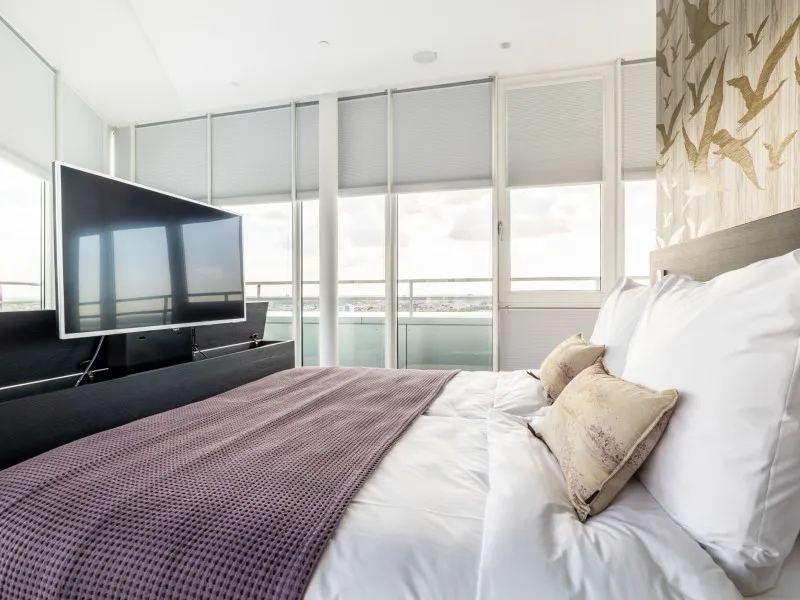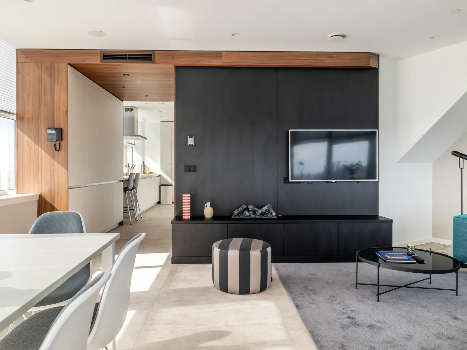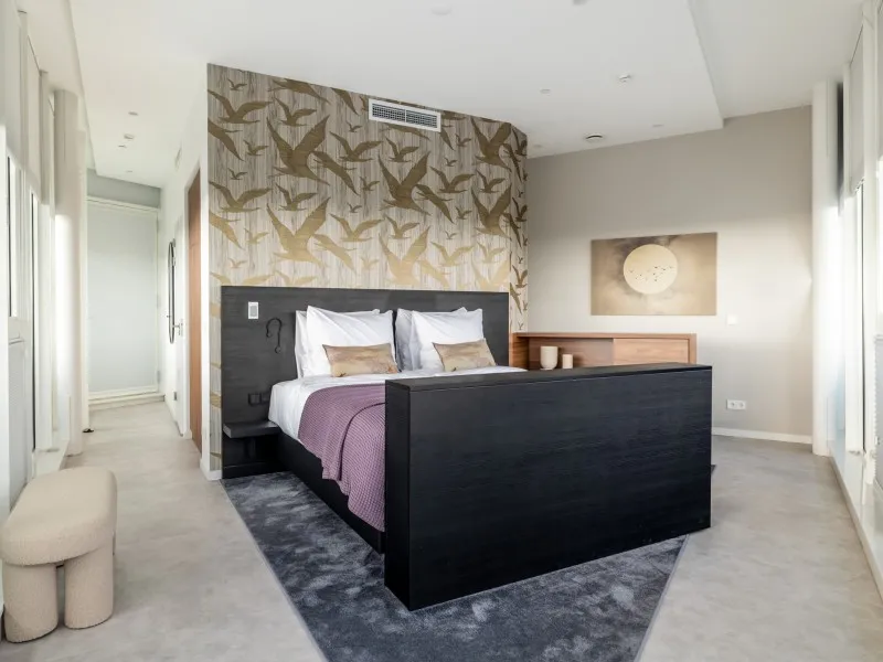 The penthouses on the 19th floor are finished to a high standard and feature a spacious living room with a comfortable corner sofa and armchair. The modern kitchen comes with built-in appliances, including a convenient washer-dryer combination, and the apartment also has a separate toilet. The dining area seats six, making it perfect for hosting and dining with guests. A fixed staircase leads to the second floor, where the bedroom is located with a comfortable double bed and a second flat-screen TV. The generous bathroom features a walk-in shower and also includes a second toilet.
