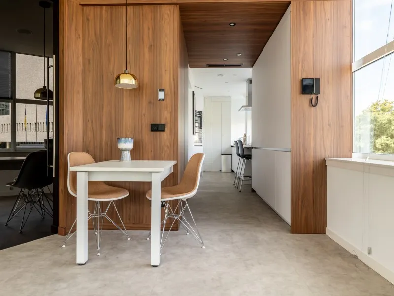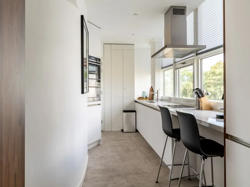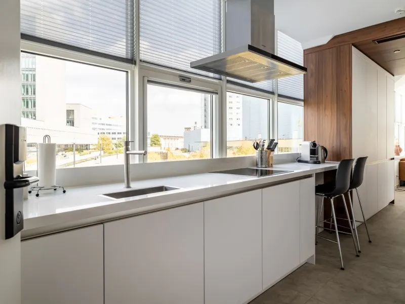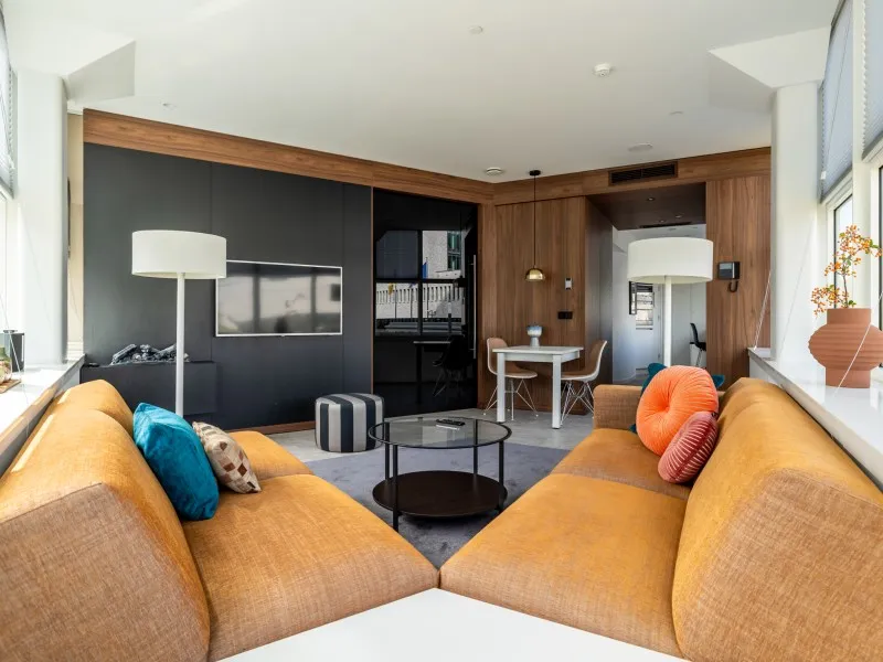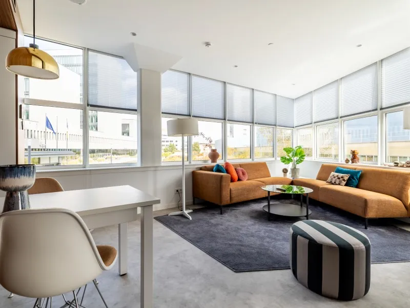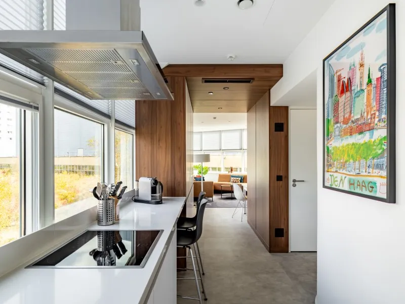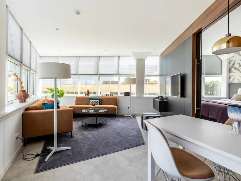 Type 1 appartementen bevinden zich op de 1e tot en met de 4e verdieping en zijn hoogwaardig afgewerkt en voorzien van een moderne keuken met inbouwapparatuur, waaronder een praktische was-droogcombinatie en een eettafel die ook als werkplek kan worden gebruikt. De lichte woonkamer is ingericht met een comfortabele bank en een luxe fauteuil - een perfecte plek om te ontspannen en tv te kijken.