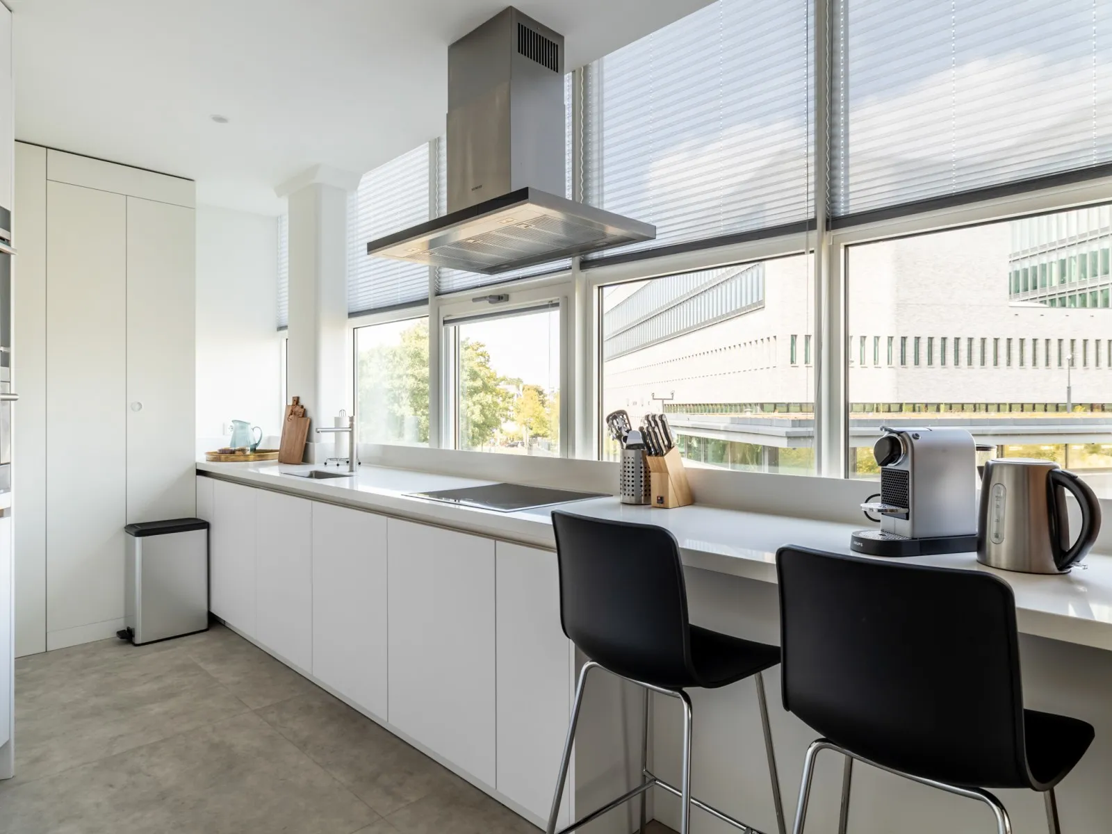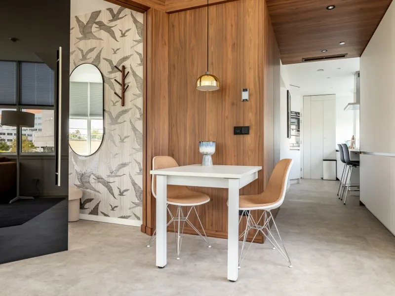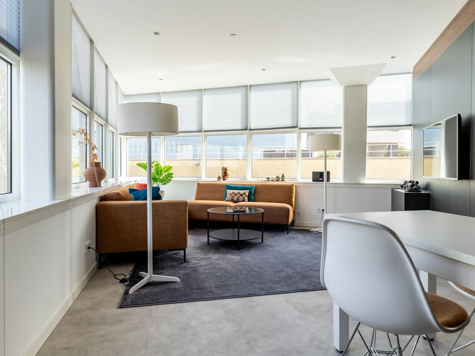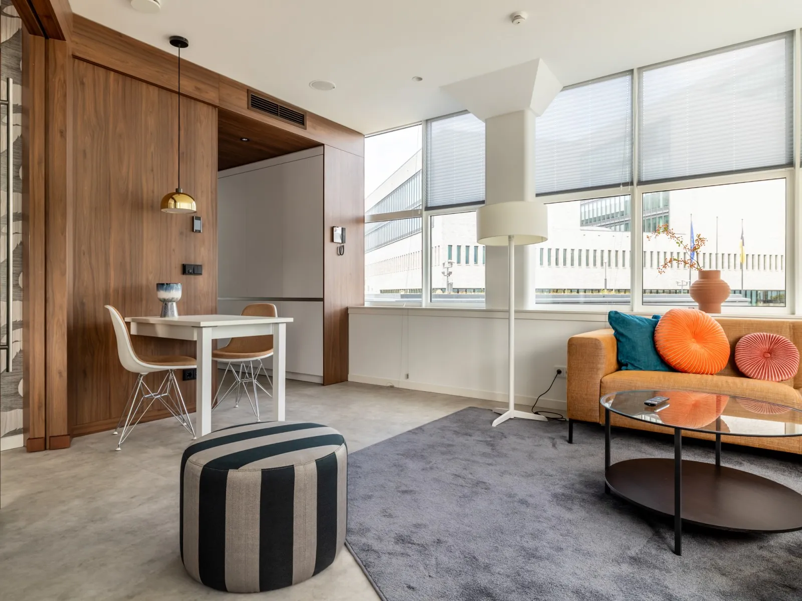 Type 1 appartementen bevinden zich op de 1e tot en met de 4e verdieping en zijn hoogwaardig afgewerkt en voorzien van een moderne keuken met inbouwapparatuur, waaronder een praktische was-droogcombinatie en een eettafel die ook als werkplek kan worden gebruikt. De lichte woonkamer is ingericht met een comfortabele bank en een luxe fauteuil - een perfecte plek om te ontspannen en tv te kijken.