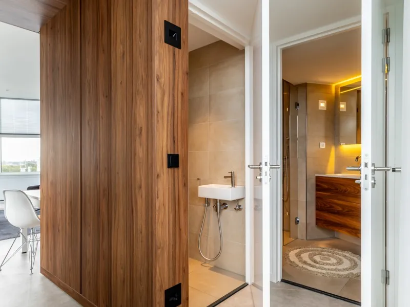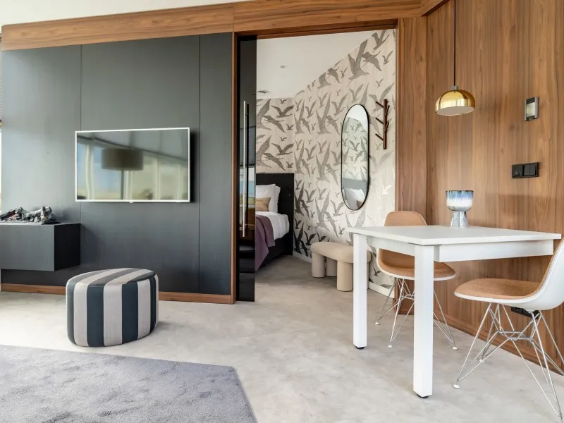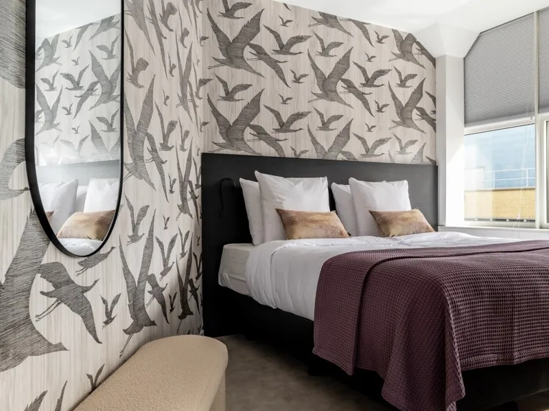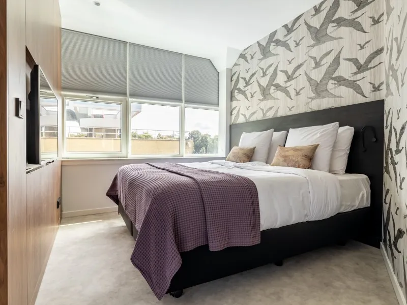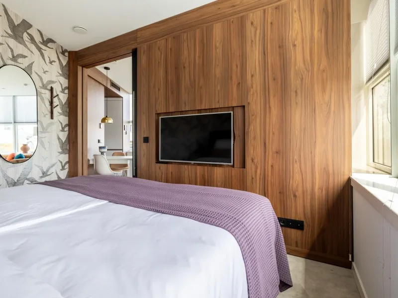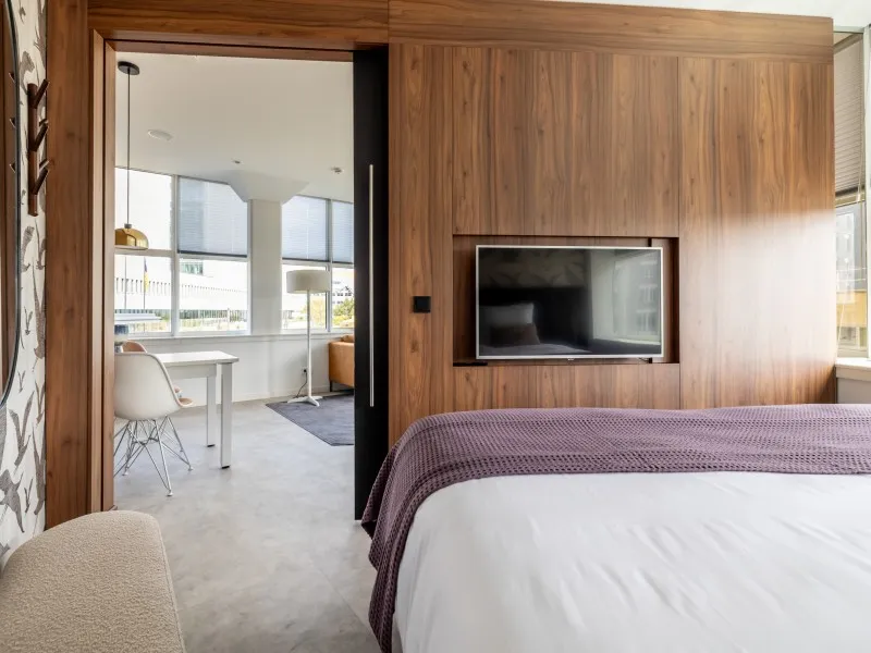 De appartementen op de 1e tot en met de 4e verdieping beschikken over een slaapkamer die volledig van de woonkamer kan worden gescheiden door een schuifwand. Hier slaap je in een comfortabel tweepersoonsbed en vind je een tweede flatscreentelevisie. De moderne badkamer met inloopdouche en wastafel ligt centraal tussen de keuken en de woonkamer, samen met een apart toilet voor extra comfort.