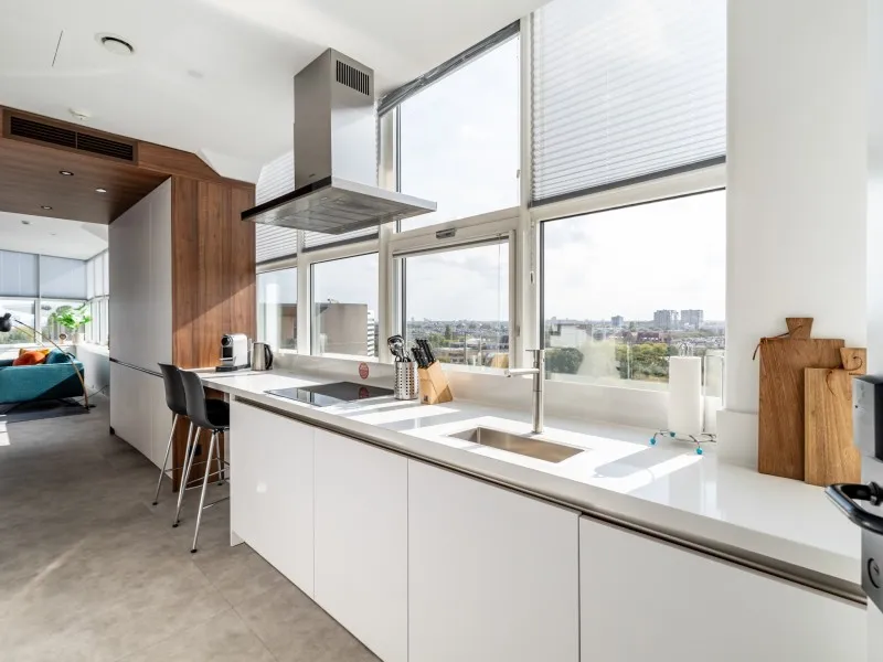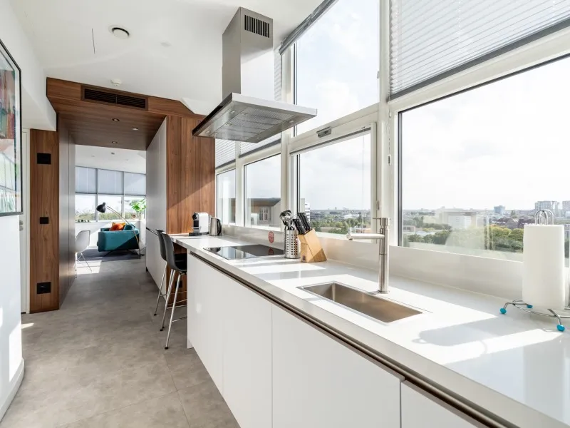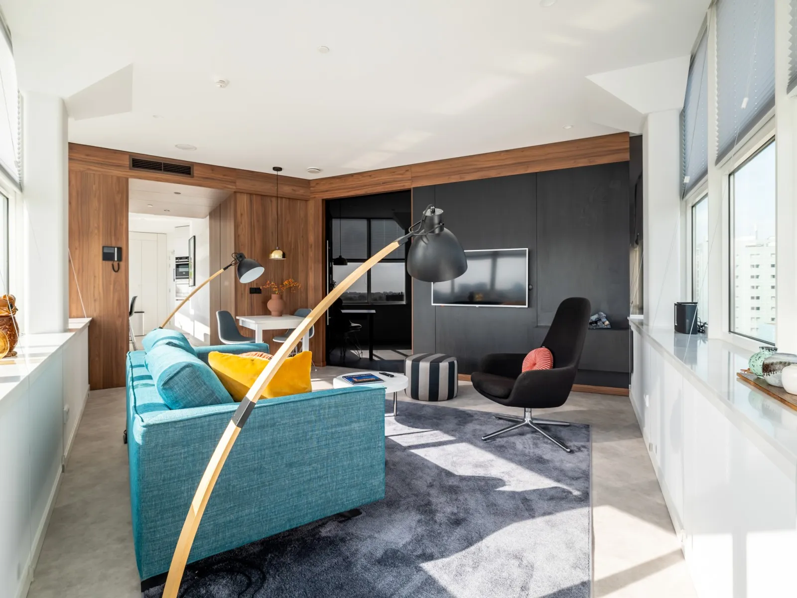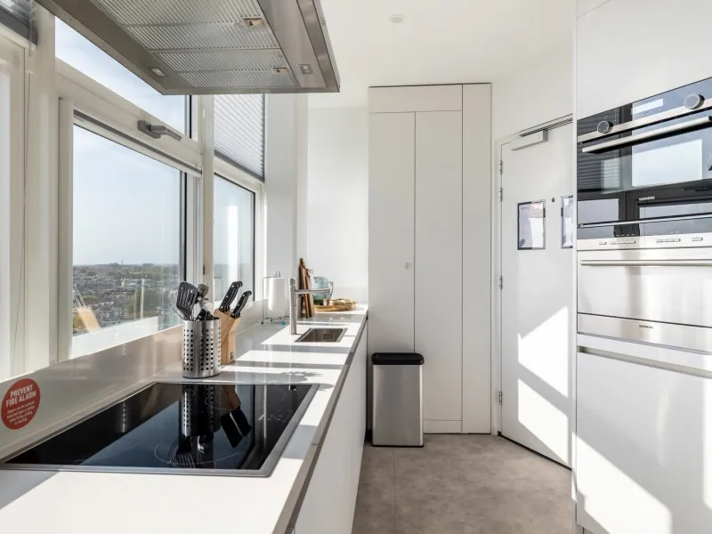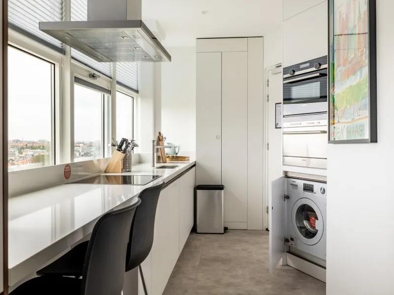 Type 2 appartementen zijn qua indeling identiek aan type 1, maar bevinden zich op de 5e tot en met de 11e verdieping en bieden een panoramisch uitzicht over Den Haag en de kustlijn. De appartementen zijn hoogwaardig afgewerkt en beschikken over een moderne keuken met inbouwapparatuur, waaronder een praktische was-droogcombinatie en een eettafel die ook als werkplek kan worden gebruikt. De lichte woonkamer is ingericht met een comfortabele bank en een luxe fauteuil - een perfecte plek om ontspannen tv te kijken of gewoon te genieten van het prachtige uitzicht.