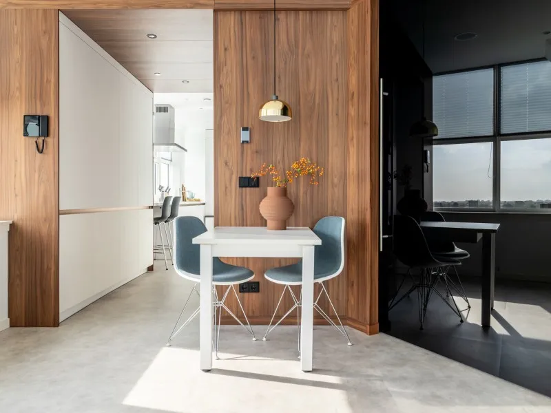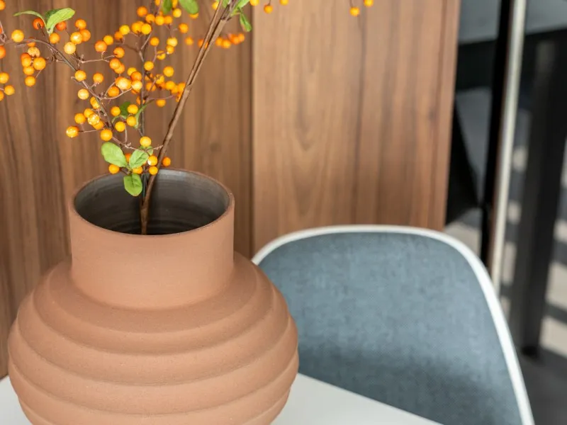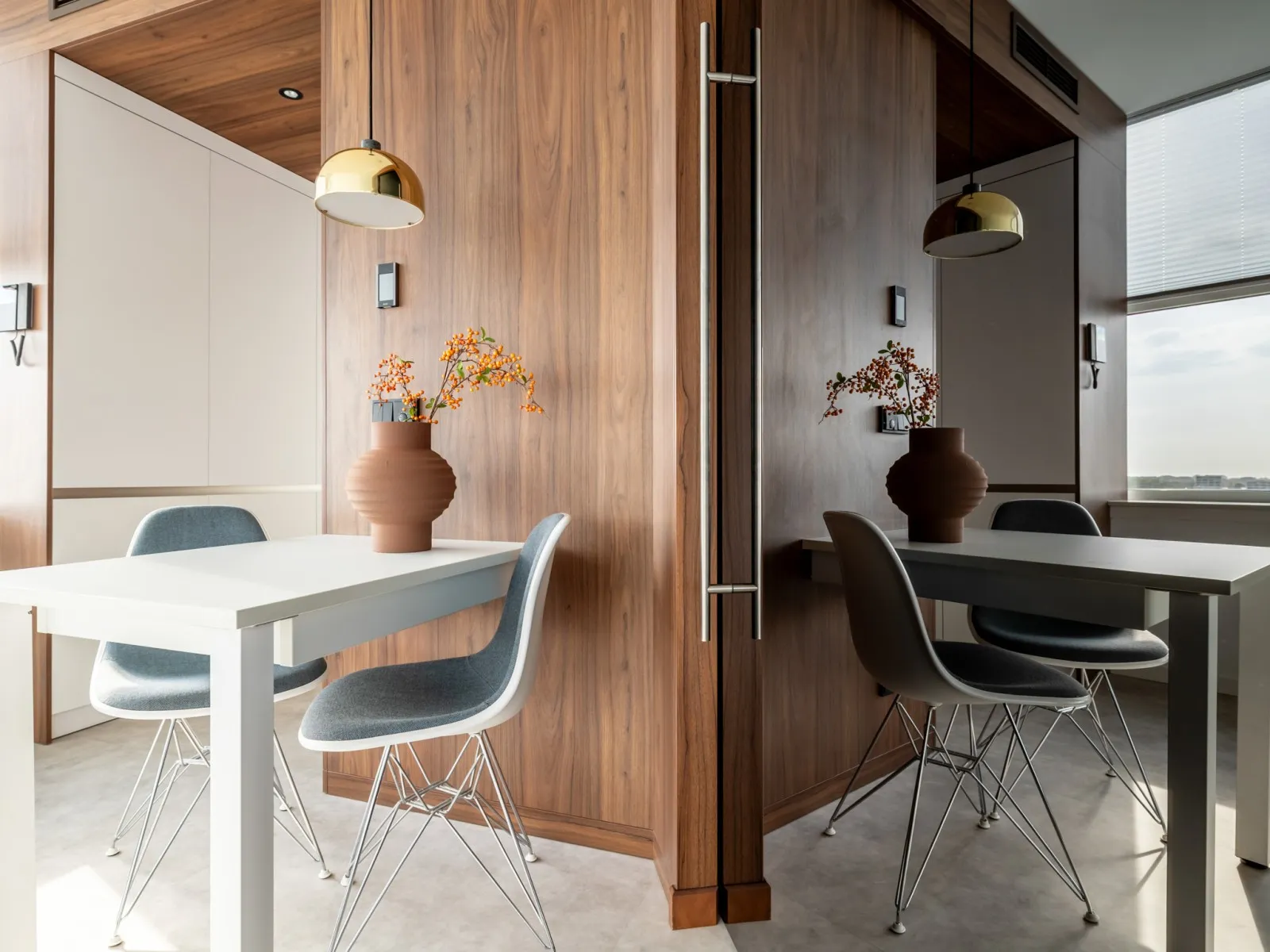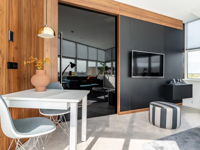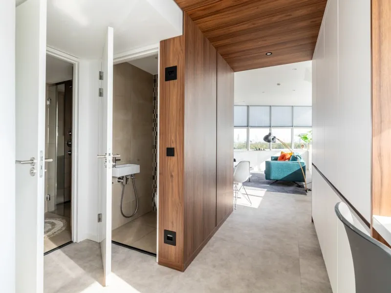 Type 2 appartementen zijn qua indeling identiek aan type 1, maar bevinden zich op de 5e tot en met de 11e verdieping en bieden een panoramisch uitzicht over Den Haag en de kustlijn. De appartementen zijn hoogwaardig afgewerkt en beschikken over een moderne keuken met inbouwapparatuur, waaronder een praktische was-droogcombinatie en een eettafel die ook als werkplek kan worden gebruikt. De lichte woonkamer is ingericht met een comfortabele bank en een luxe fauteuil - een perfecte plek om ontspannen tv te kijken of gewoon te genieten van het prachtige uitzicht.