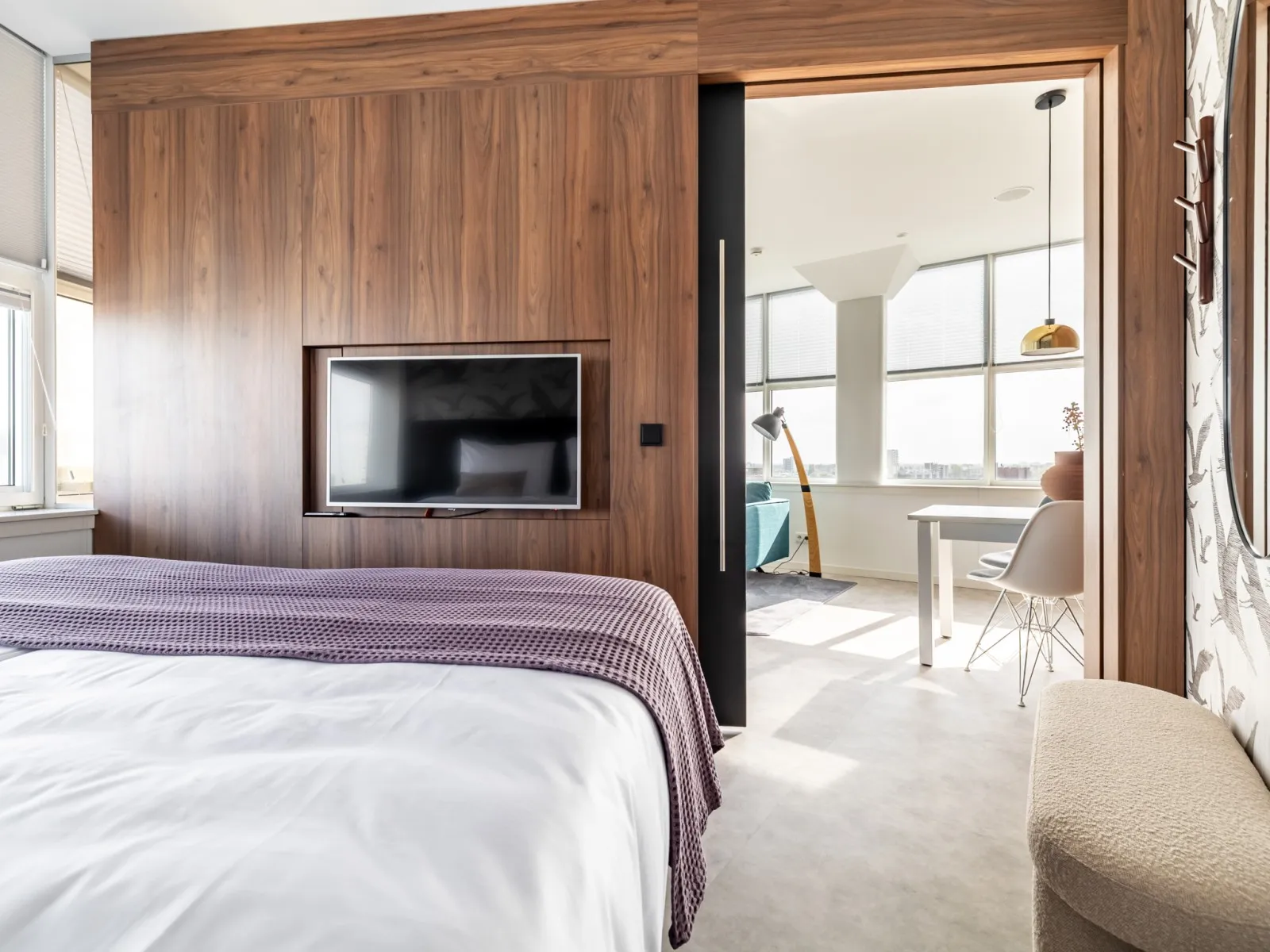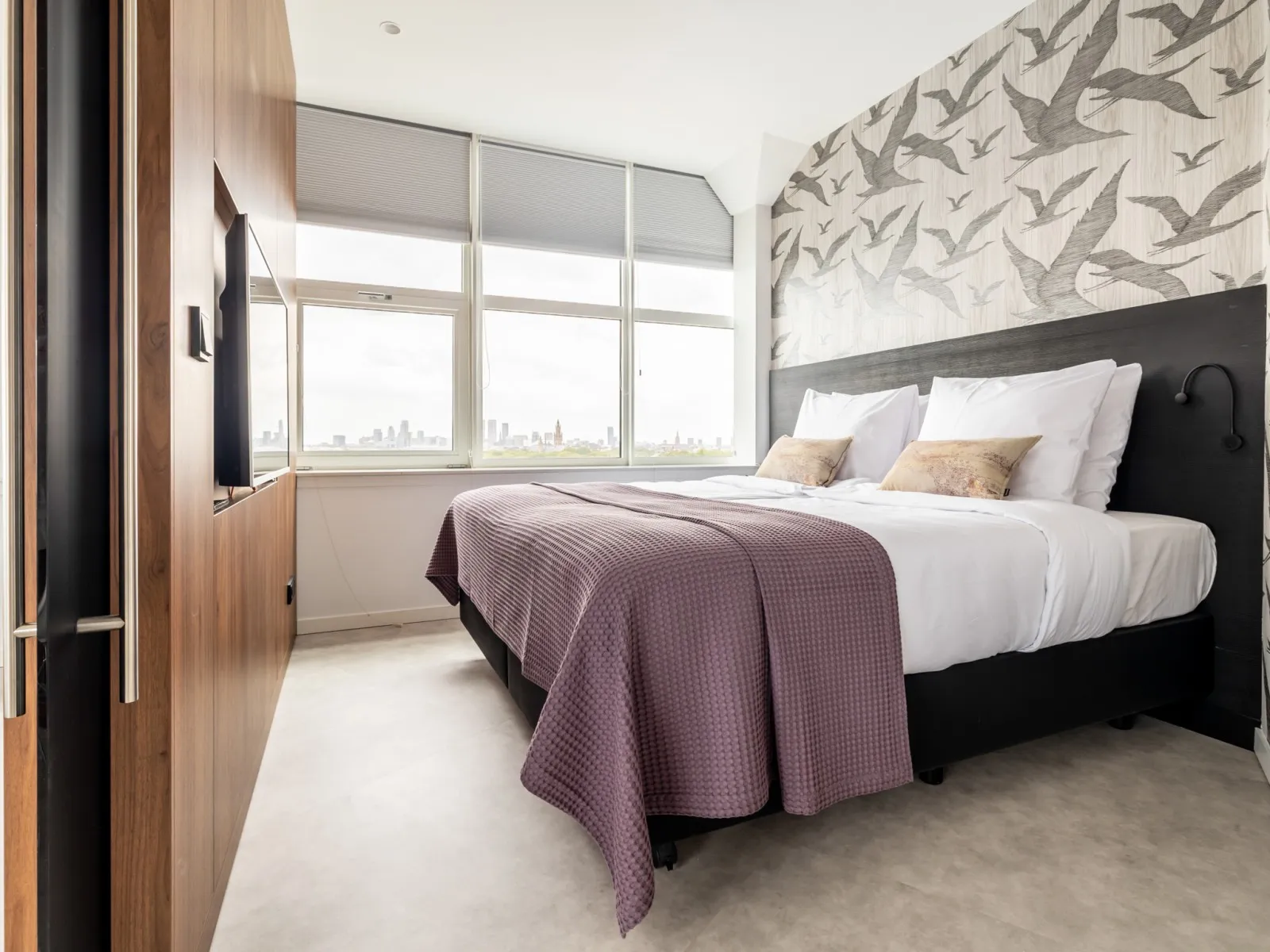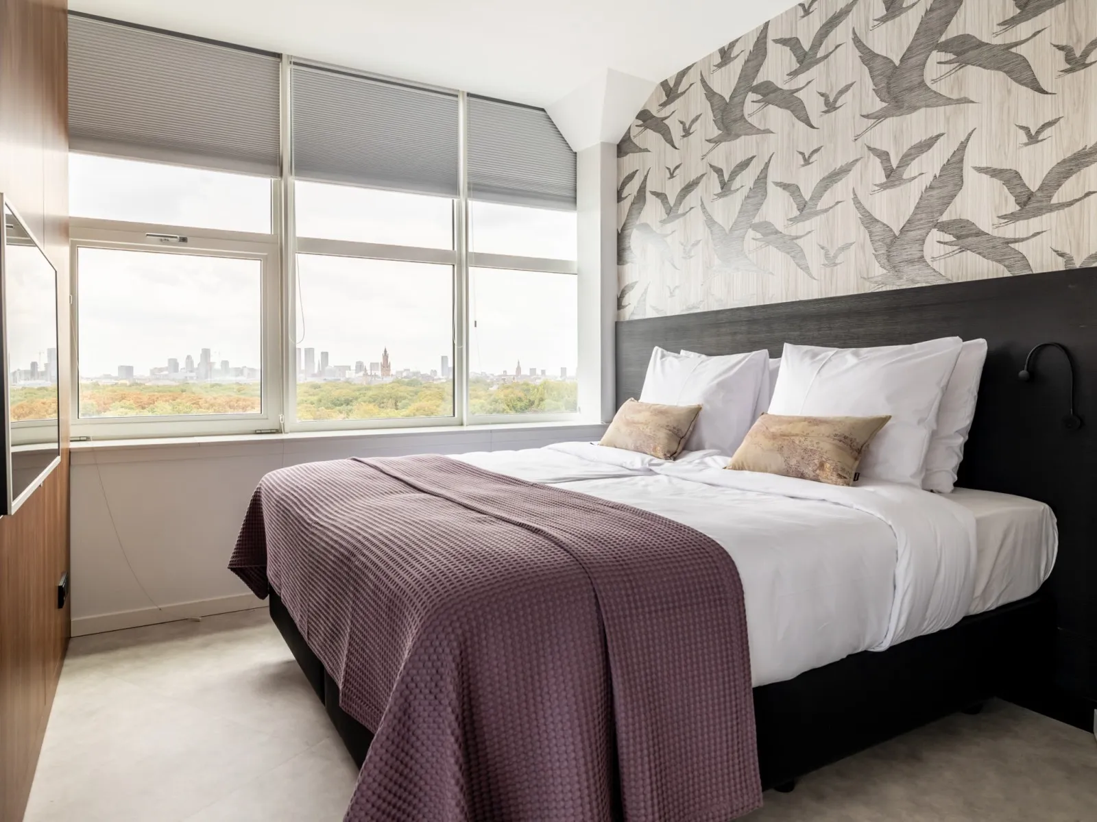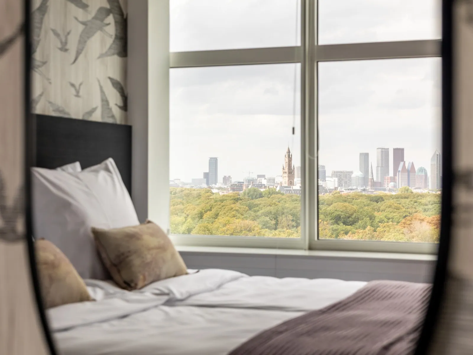 Gelegen op de 5e tot en met de 11e verdieping bieden deze appartementen een prachtig uitzicht over Den Haag. Het spel van licht en seizoenen zorgt ervoor dat het panorama telkens weer anders is en je steeds opnieuw blijft kijken. De slaapkamer kan volledig worden gescheiden van de woonkamer door een schuifwand. Hier slaap je heerlijk in een comfortabel tweepersoonsbed en vind je een tweede flatscreentelevisie. De moderne badkamer met inloopdouche en wastafel ligt centraal tussen de keuken en de woonkamer, samen met een apart toilet wat zorgt voor extra comfort.