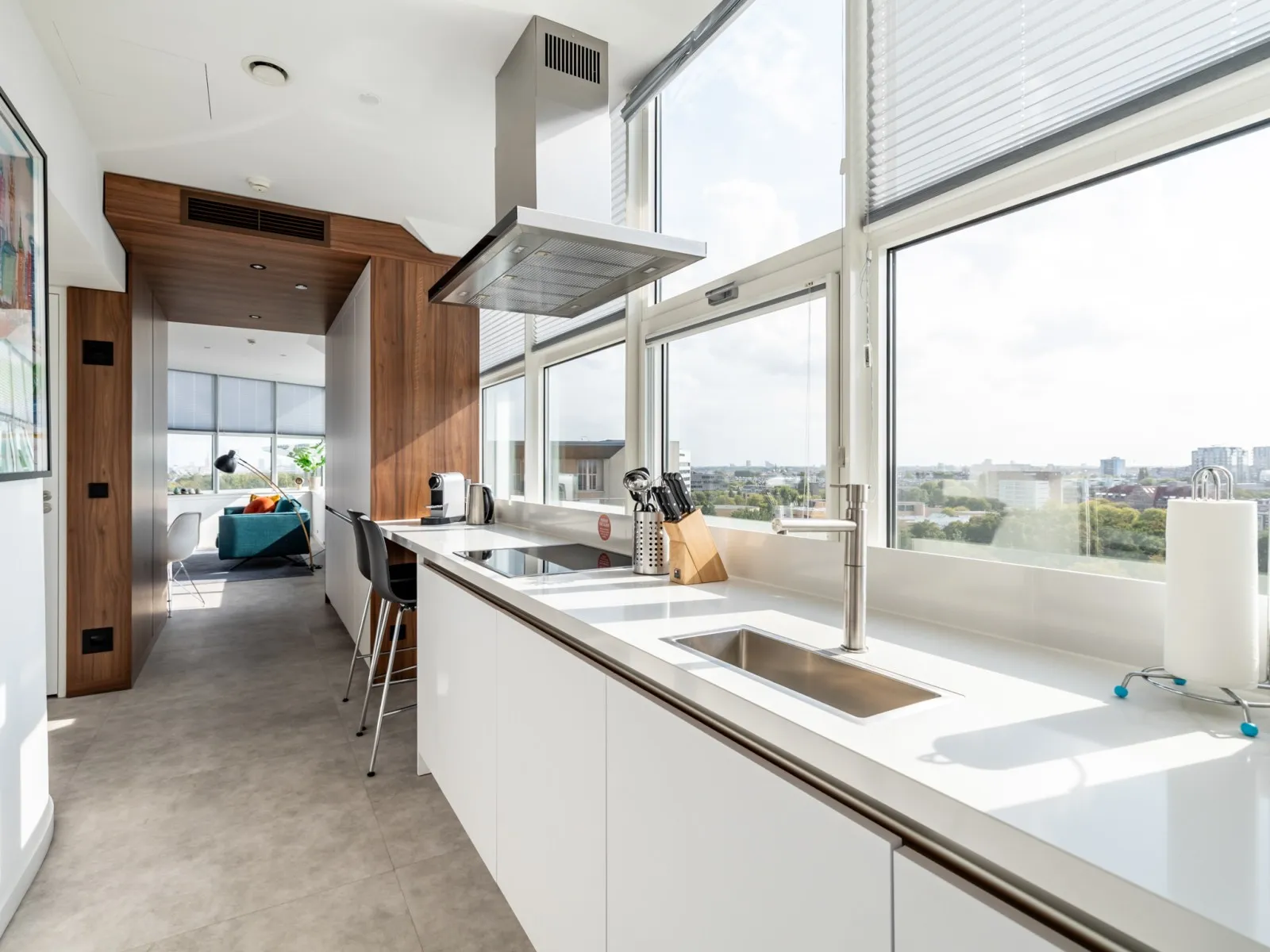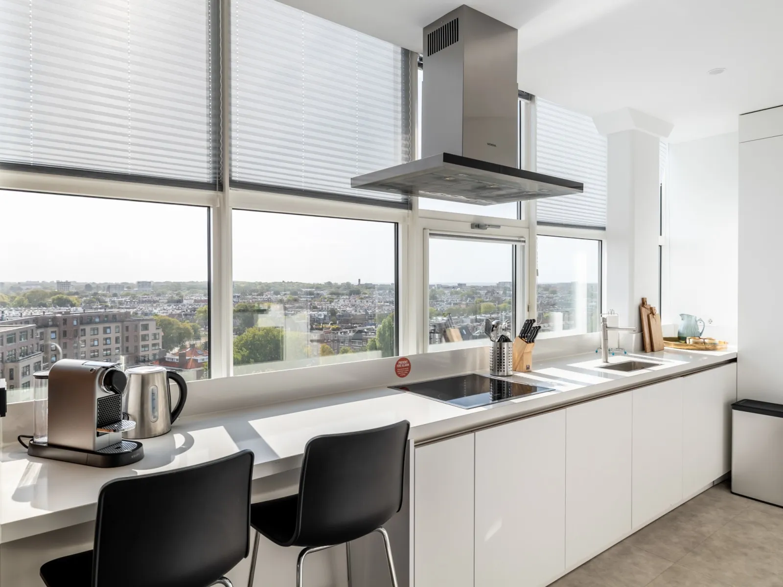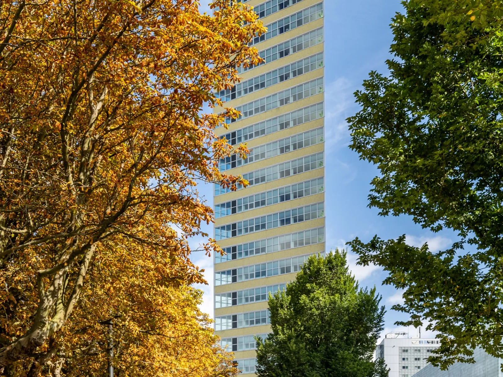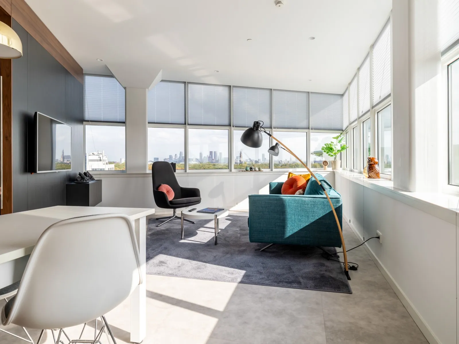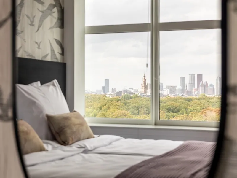 Gelegen op de 5e tot en met de 11e verdieping bieden deze appartementen een prachtig uitzicht over Den Haag. Het spel van licht en seizoenen zorgt ervoor dat het panorama telkens weer anders is en je steeds opnieuw blijft kijken. De slaapkamer kan volledig worden gescheiden van de woonkamer door een schuifwand. Hier slaap je heerlijk in een comfortabel tweepersoonsbed en vind je een tweede flatscreentelevisie. De moderne badkamer met inloopdouche en wastafel ligt centraal tussen de keuken en de woonkamer, samen met een apart toilet wat zorgt voor extra comfort.