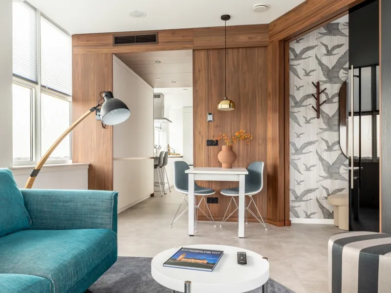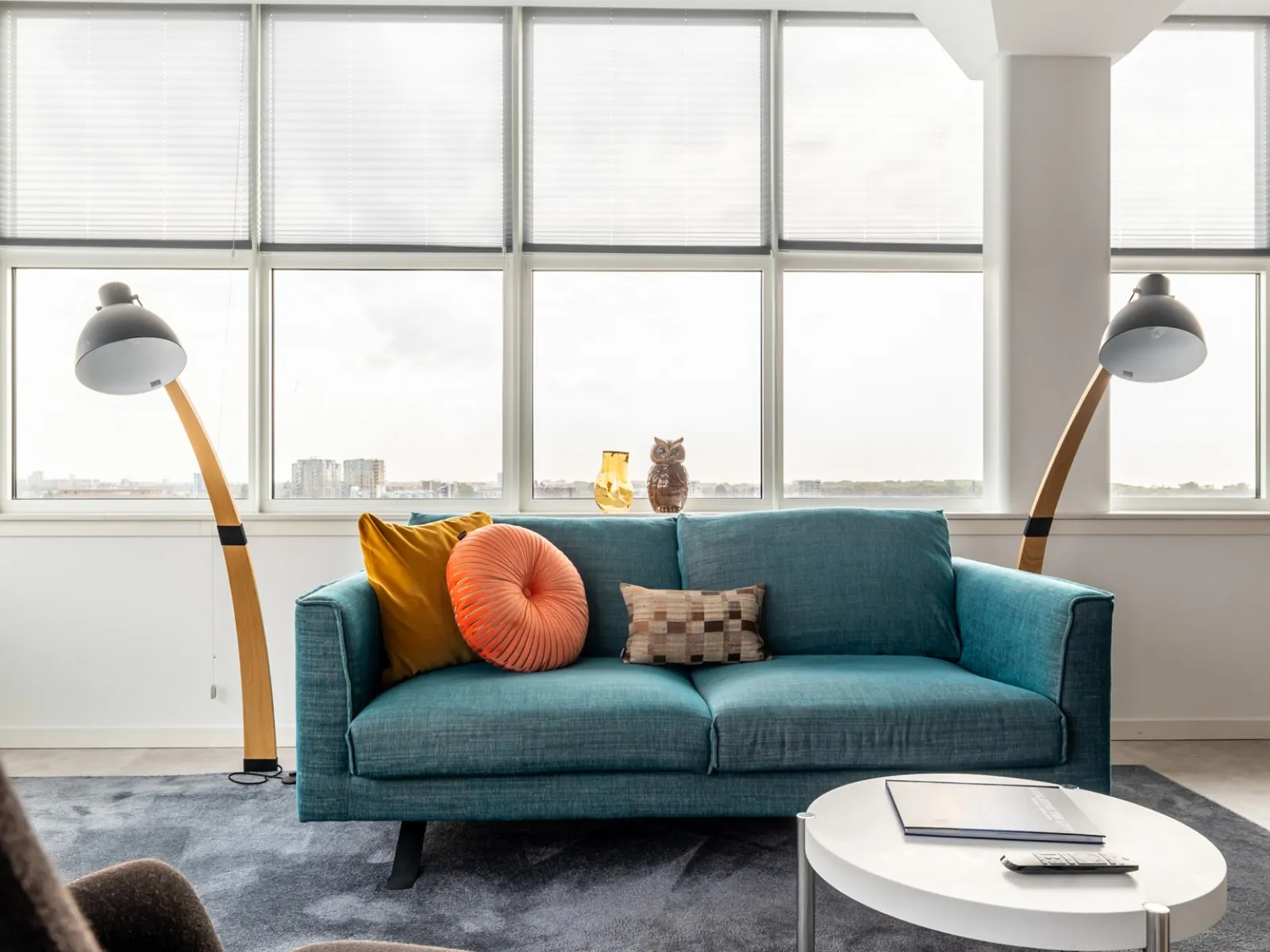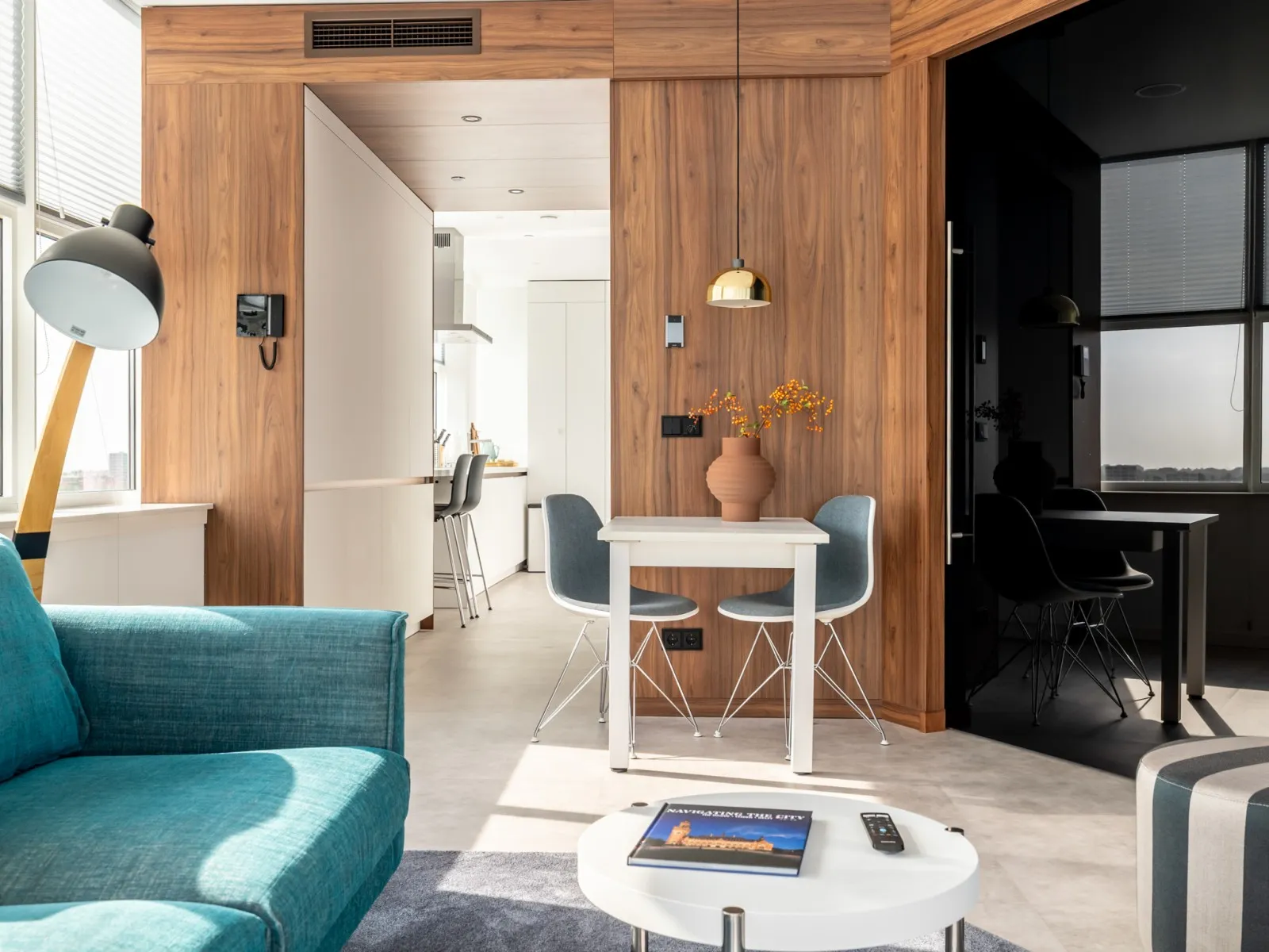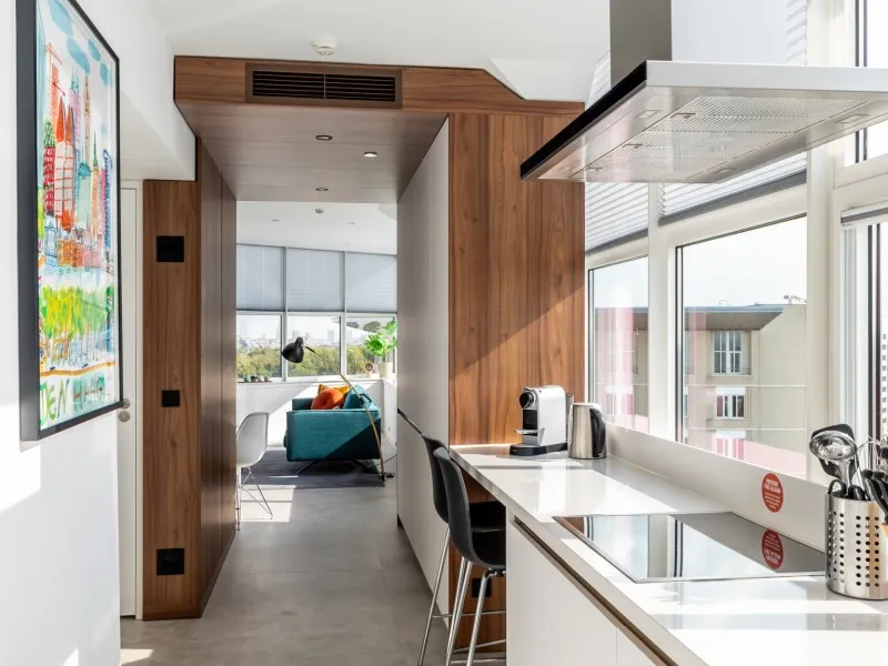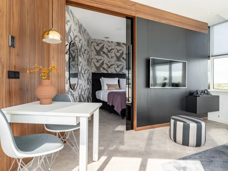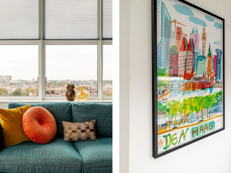 Gelegen op de 5e tot en met de 11e verdieping bieden deze appartementen een prachtig uitzicht over Den Haag. Het spel van licht en seizoenen zorgt ervoor dat het panorama telkens weer anders is en je steeds opnieuw blijft kijken. De slaapkamer kan volledig worden gescheiden van de woonkamer door een schuifwand. Hier slaap je heerlijk in een comfortabel tweepersoonsbed en vind je een tweede flatscreentelevisie. De moderne badkamer met inloopdouche en wastafel ligt centraal tussen de keuken en de woonkamer, samen met een apart toilet wat zorgt voor extra comfort.