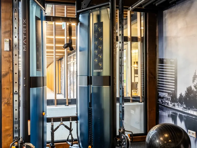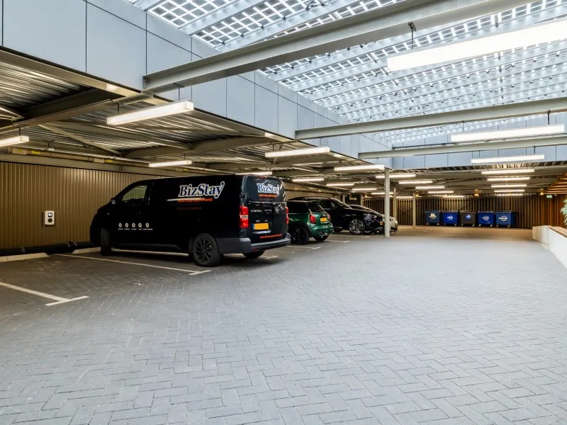 Onder de appartementen is een centrale ontvangsthal met koffiehoek en fitnessruimte waar gasten gratis toegang toe hebben. Voor degenen die met de (elektrische) auto komen, is er een overdekte en beveiligde parkeergarage met 4 oplaadpunten. De locatie is echter ook uitstekend bereikbaar met het openbaar vervoer.